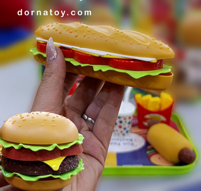 ست اسباب بازی سینی فست فود شامل:ساندویچ،قوطی،سینی،سس،هات داگ،همبرگر و سیب زمینی میباشد.